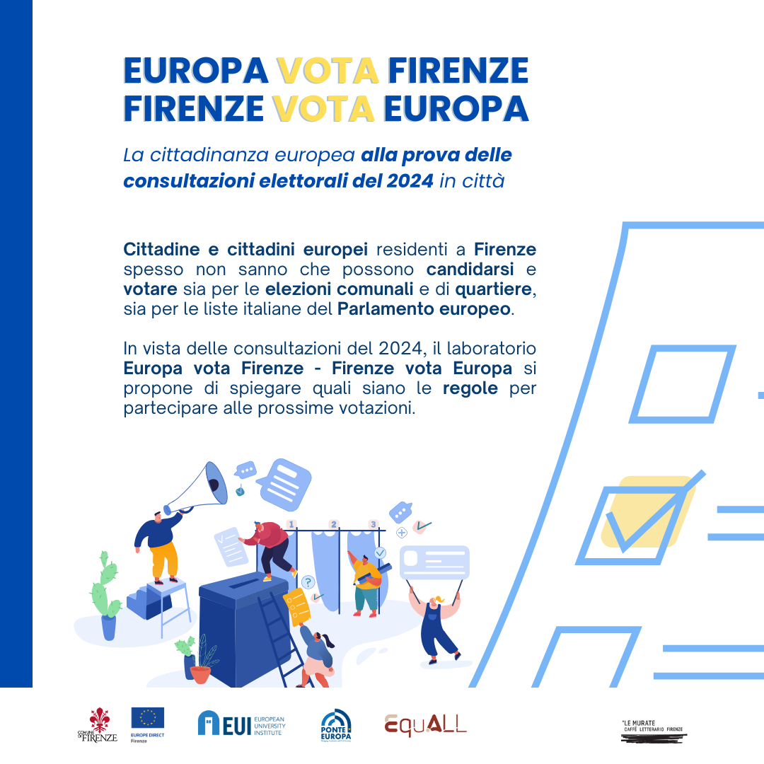 Lunedì 27 novembre alle ore 18:00 al Caffè Letterario Le Murate si terrà l’incontro “Europa vota Firenze – Firenze vota Europa”, organizzato da EUROPE DIRECT Firenze con l’Istituto Universitario Europeo, Ponte Europa e EquAll con l’intento di informare i cittadini su diritti e modalità con cui si svolgeranno le elezioni europee e amministrative.