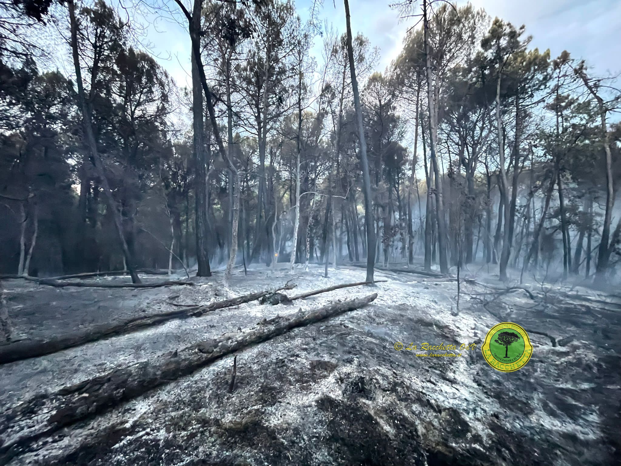 La Racchetta odv competente sul territorio interessato, ha inviato 20 squadre nelle prime tre ore dell' incendio poiché il rischio era che l'incendio assumesse proporzioni fuori dalla capacità di spegnimento vista l'estensione in continuità del bosco e il tipo di vegetazione interessata (pineta estesa per circa 200 ettari). Una cinquantina i volontari impiegati in un duro lavoro necessario non solo per combattere le fiamme ma anche per le lunghe operazioni di bonifica che durate tutta la notte, sono tutt'ora in corso.