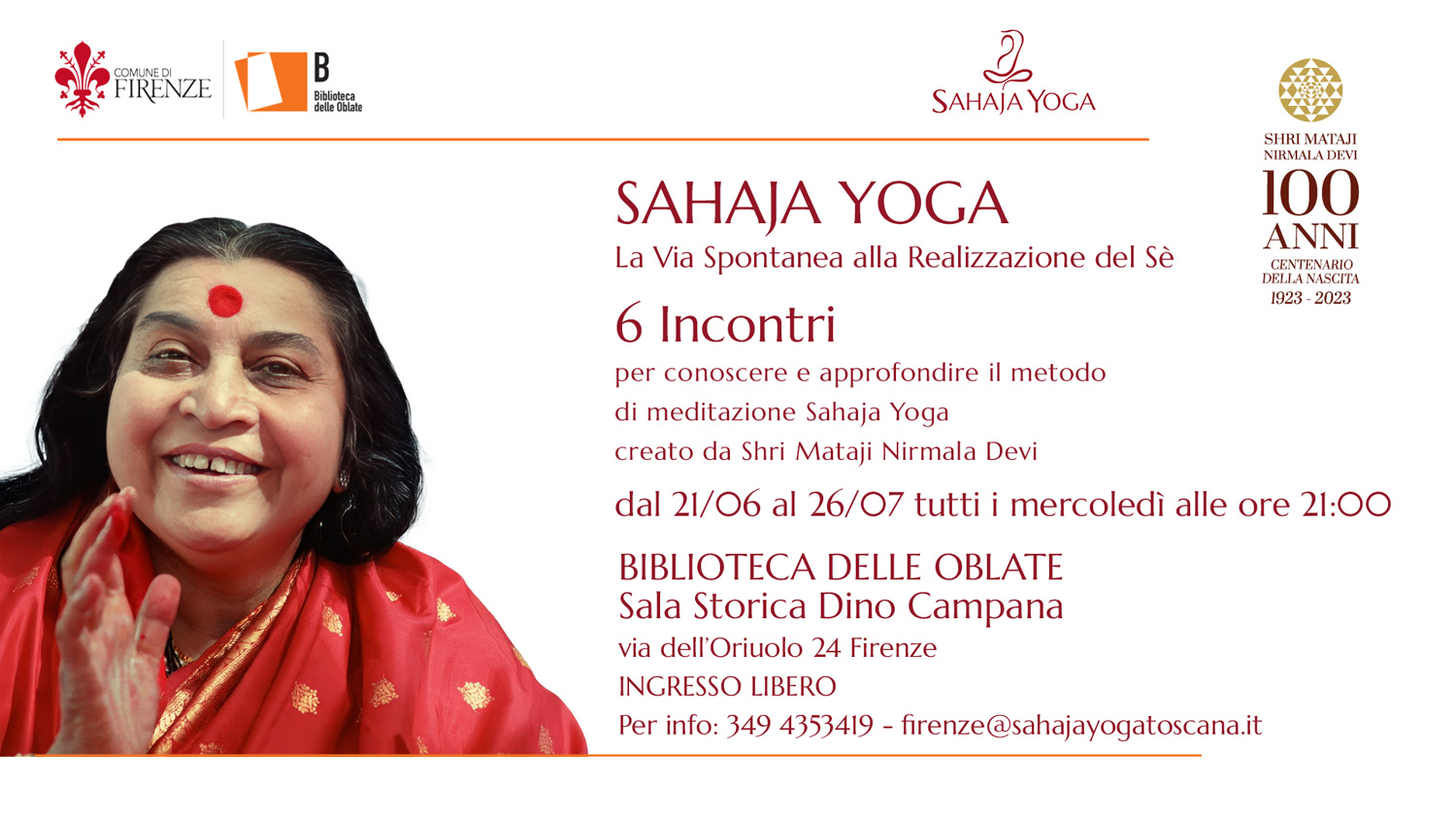 Si tratta di sei incontri, patrocinati dal Comune di Firenze e dalla Biblioteca delle Oblate, per conoscere e approfondire il metodo di meditazione Sahaja Yoga, partner ufficiale dell’Unesco Center for Peace, creato e diffuso da Shri Mataji in oltre 90 paesi del mondo. Sperimentare il risveglio della Kundalini, l'energia madre presente in ogni essere umano, questo l'obiettivo del corso.