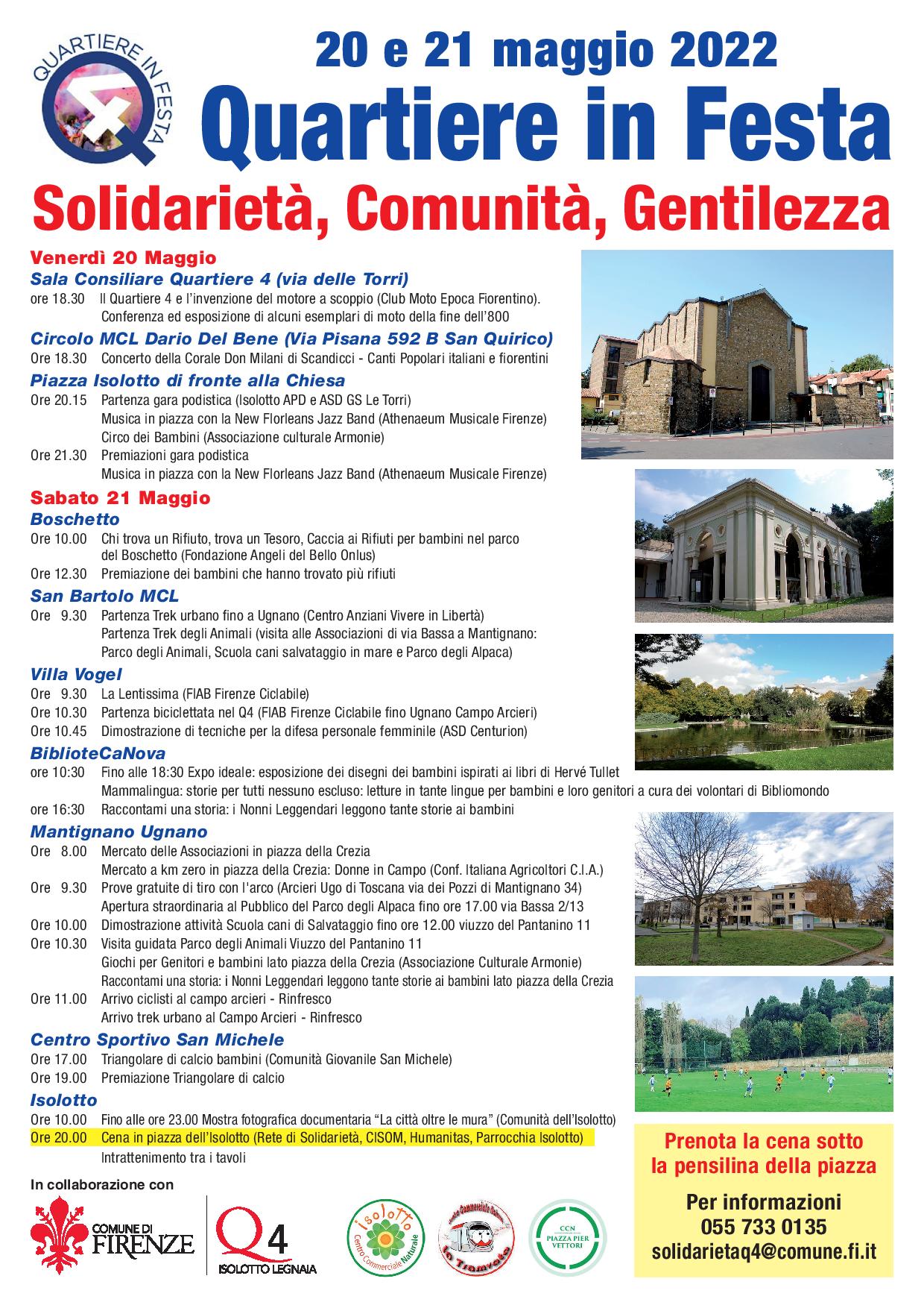 In primo piano ‘Tutti a cena insieme’, la grande cena di sabato 21 maggio alle 19.30, in piazza dell’Isolotto, il cui ricavato sarà destinato al progetto “Rete di solidarietà Q4, un progetto sociale verso una Comunità di Rete” i cui fondi, tramite il Fondo Essere, sono destinati alle famiglie in difficoltà del Quartiere ed è organizzata da Rete di Solidarietà, Cisom, Humanitas e Parrocchia dell’Isolotto. Maxischermo in piazza per seguire la partita Fiorentina-Juventus.