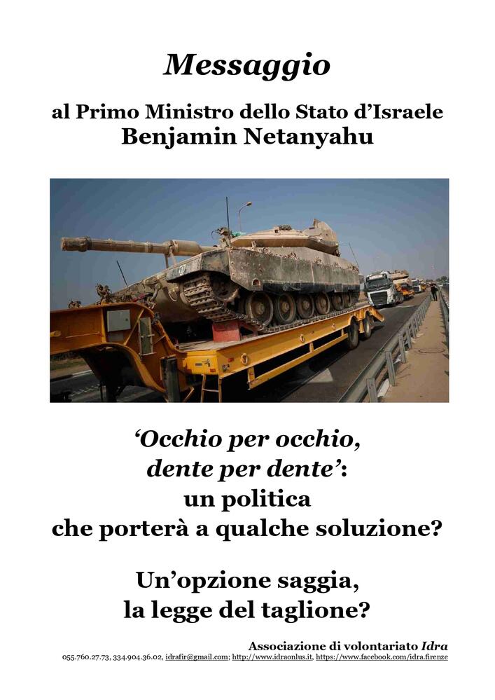 L’appuntamento è in Via della Spada 2, dove l'Associazione di volontariato Idra distribuirà un volantino in italiano e in inglese ai passanti dinanzi alla sede del Consolato onorario dello Stato di Israele, dalle 14.30 alle 16.00. L'obiettivo è di consegnare l'invito a desistere militarmente al Console onorario Marco Carrai, perché se ne faccia latore al Primo Ministro Benjamin Netanyahu.