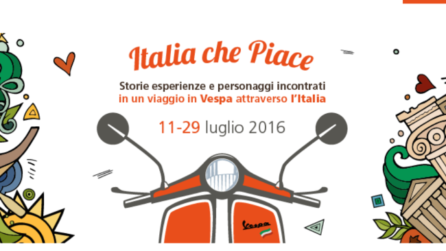 "Italia che piace - Un Viaggio in Vespa" è il tour che dall'11 al 29 luglio vede protagoniste tre Vespa, simbolo dell'eccellenza italiana nel mondo (marchio che proprio quest'anno compie 70 anni) guidate da tre appassionati delle due ruote che amano l’Italia: Piero Rocca, Piero Muscari e Massimo Petrucci (imprenditore, giornalista, ed esperto di web marketing).