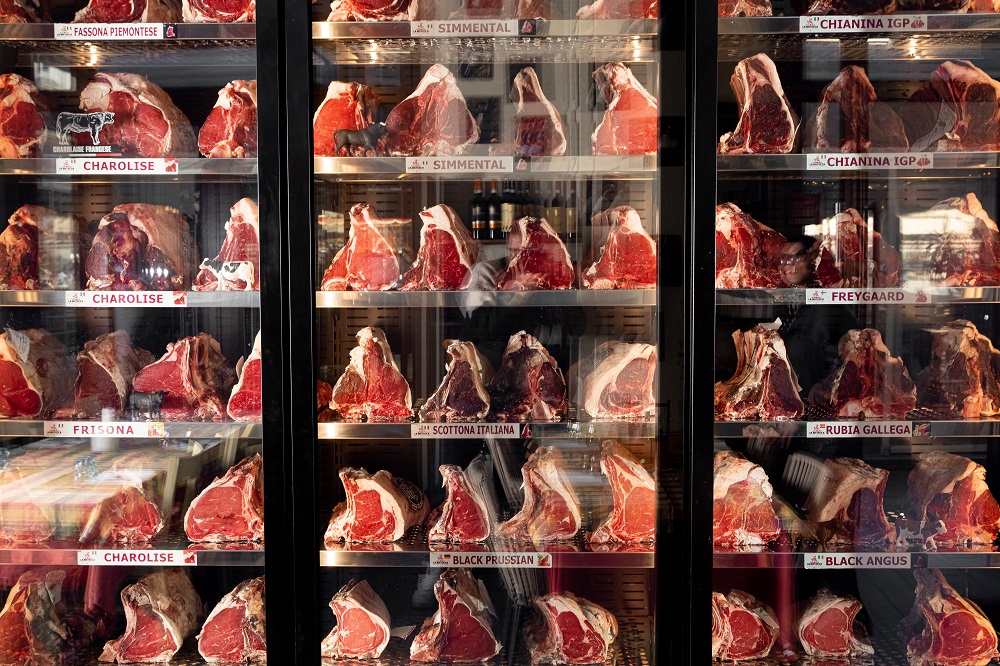 Difatti, all’interno del ristorante è presente una maxi vetrina espositiva di 4 metri contenente oltre 10 tipologie di carni selezionate da tutto il mondo, tra cui: Chianina IGP della Val di Chiana, Black Angus irlandese, Sashi finlandese, Rubia Gallega spagnola e Kobe Italiana.
