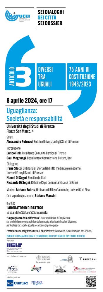 A dialogare sul nesso uguaglianza e responsabilità, a Firenze, saranno ospiti d’eccezione: Irene Stolzi, Ordinaria di Storia del diritto medioevale e moderno dell’Università di Firenze, Noemi Di Segni, Presidente UCEIe Riccardo Di Segni, Rabbino Capo della Comunità Ebraica di Roma. Modererà l’incontro Adriano Fabris, Professore Ordinario di Filosofia morale all'Università di Pisa, particolarmente attento a questi temi, anche dal punto di vista del pensiero ebraico.