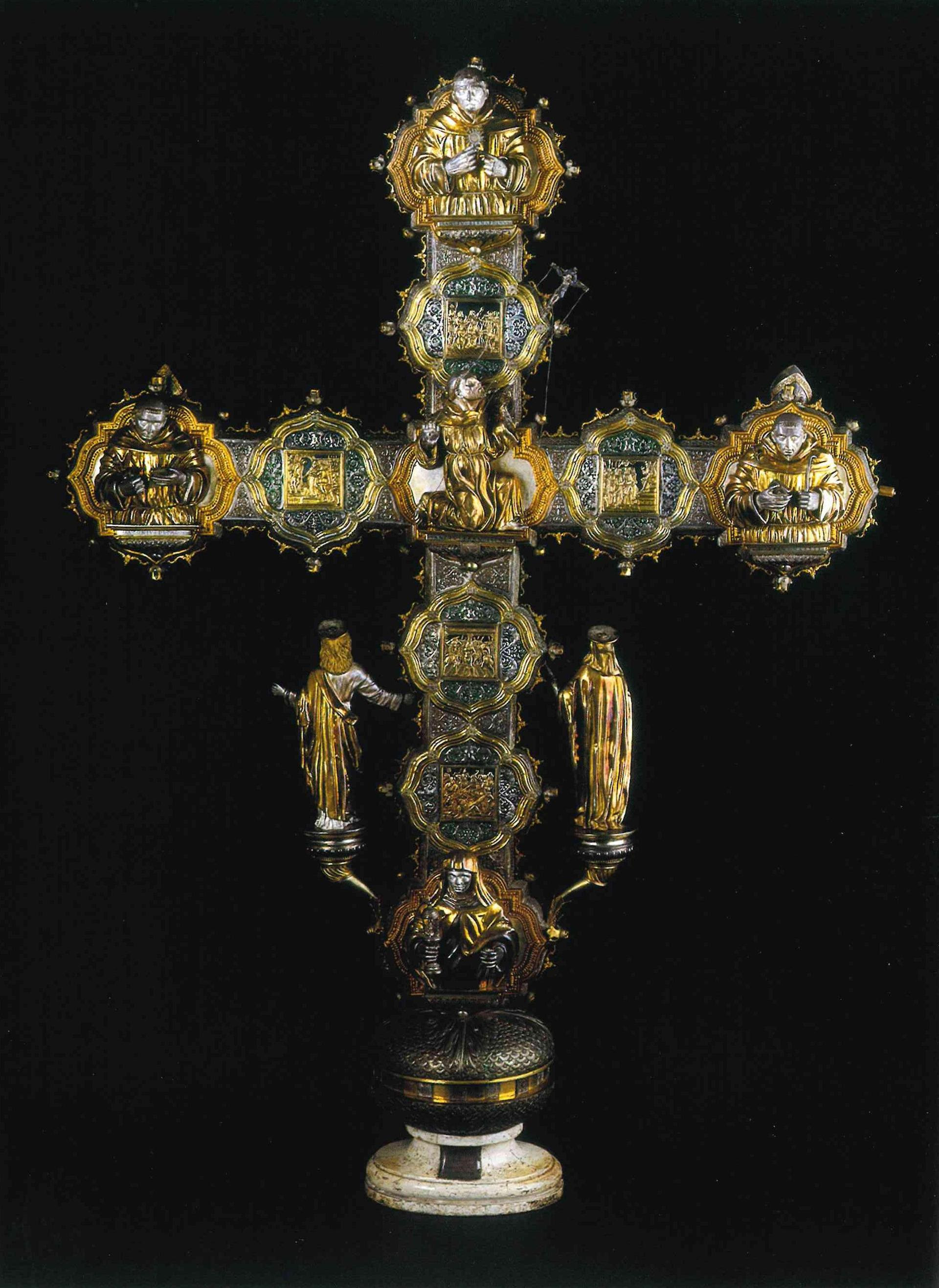 Il manufatto di alta oreficeria venne realizzato grazie al cospicuo lascito testamentario di frate Francesco Sansone de Brixia, ministro generale dell’Ordine francescano dal 1475 al 1499. L’erudito committente diede indicazioni precise sui temi iconografici da sviluppare nell’esecuzione dell’opera che venne pensata come una sorta di santorale francescano con i principali rappresentanti dell’Ordine, disposti lungo i bracci della croce, che si raccolgono intorno alle figure centrali di Cristo in croce e san Francesco, rappresentato nell’atto di ricevere le stimmate.