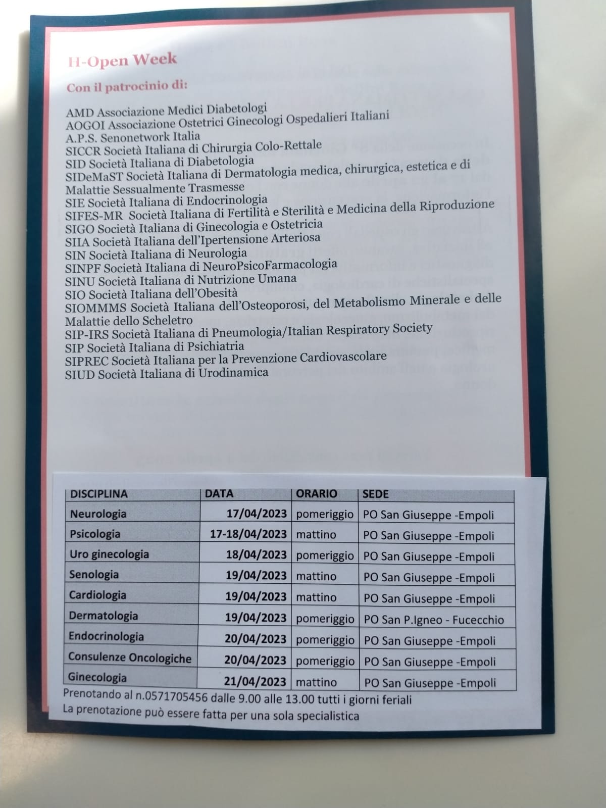 In occasione della “H-Open Week Salute della Donna” (17-22 aprile) gli ospedali fiorentini di Santa Maria Annunziata, San Giovanni di Dio e, a Borgo San Lorenzo, l’ospedale del Mugello offriranno servizi gratuiti, clinici, diagnostici e informativi, in diverse aree specialistiche in uno o più giorni della settimana dedicata.