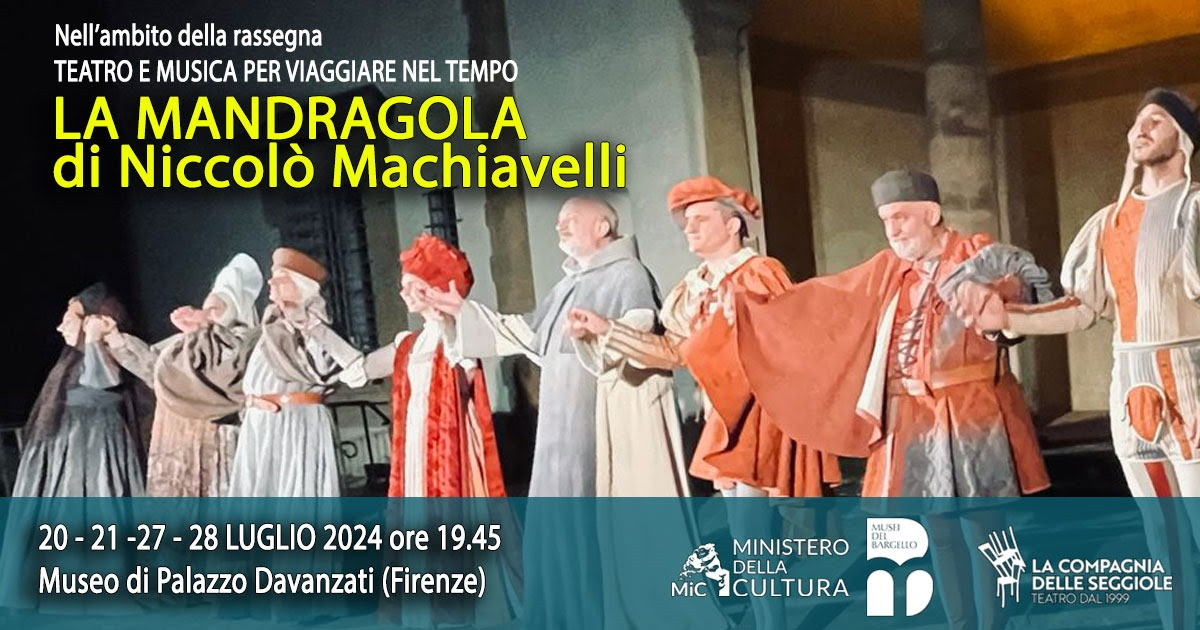 Nell'ambito della rassegna "Teatro e Musica per viaggiare nel tempo", quattro appuntamenti con "La Mandragola" di Niccolรฒ Machiavelli, nel cortile di Palazzo Davanzati a Firenze. ๐๐๐ญ๐ ๐ ๐๐ซ๐๐ซ๐ข: sabato 20, domenica 21, sabato 27 e domenica 28 luglio ore 19:45. ๐๐ง๐ ๐ซ๐๐ฌ๐ฌ๐จ ๐ ๐ซ๐๐ญ๐ฎ๐ข๐ญ๐จ con regolare biglietto d'ingresso al museo.