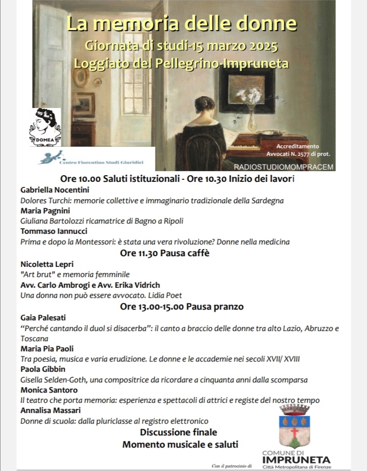 Sabato 15 marzo, a partire dalle ore 10, presso il Loggiato del Pellegrino (Piazza Buondelmonti n. 21), si terrà il convegno "La memoria delle donne", dedicato al contributo femminile in molte discipline, tra cui la storia dell'arte, la musica, la danza e il teatro. L'evento, che riceve il patrocinio del Comune di Impruneta, sarà inaugurato dai saluti istituzionali.