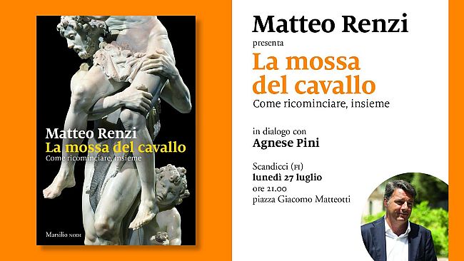 Firenze, 24 luglio – Dopo gli incontri di Firenze, Montecatini Terme, Chiusi, Forte dei Marmi, Prato, Marina di Grosseto e Livorno (che si tiene lo stesso lunedì 27 alle 18.30 al Parco del Mulino), il tour di presentazioni in Toscana del nuovo libro di Matteo Renzi, La mossa del cavallo (Marsilio), giunge lunedì 27 luglio a Scandicci, dove il leader di Italia Viva, in dialogo con Agnese Pini, incontra pubblico e lettori alle 21.00 in Piazza Giacomo Matteotti. L'incontro di presentazione, nel rispetto della sicurezza e della normativa relativa al distanziamento sociale, sarà l'occasione per condividere le proposte contenute nel libro, da mettere subito in campo per la ripartenza del Paese sul piano economico, politico, sociale, sui temi dell'educazione, del digitale, dell'idea di futuro da costruire assieme.