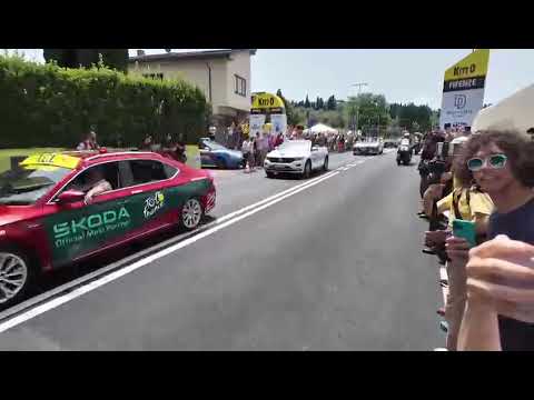 Il passaggio dal km 0 a Bagno a Ripoli davanti al Viola Park ha segnato la vera partenza del Tour de France 2024, dopo il trasferimento non competitivo dalle Cascine attraverso il centro di Firenze per poi arrivare alla partenza stessa.