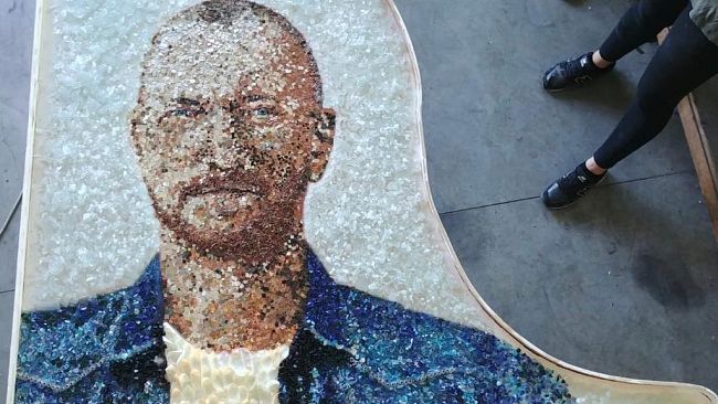 Per il ritratto di Biagio Antonacci le giovani artiste hanno scelto di definirne i tratti del volto aiutandosi con placche di metallo con sfumature bronzee e oro, perline per gli occhi e svariati petali di fiori finti per la t-shirt. Le scaglie di plastica riciclata provenienti dall'azienda trevigiana Aliplast del Gruppo Hera sono infine servite per definire tutte le sfumature di colore della giacca