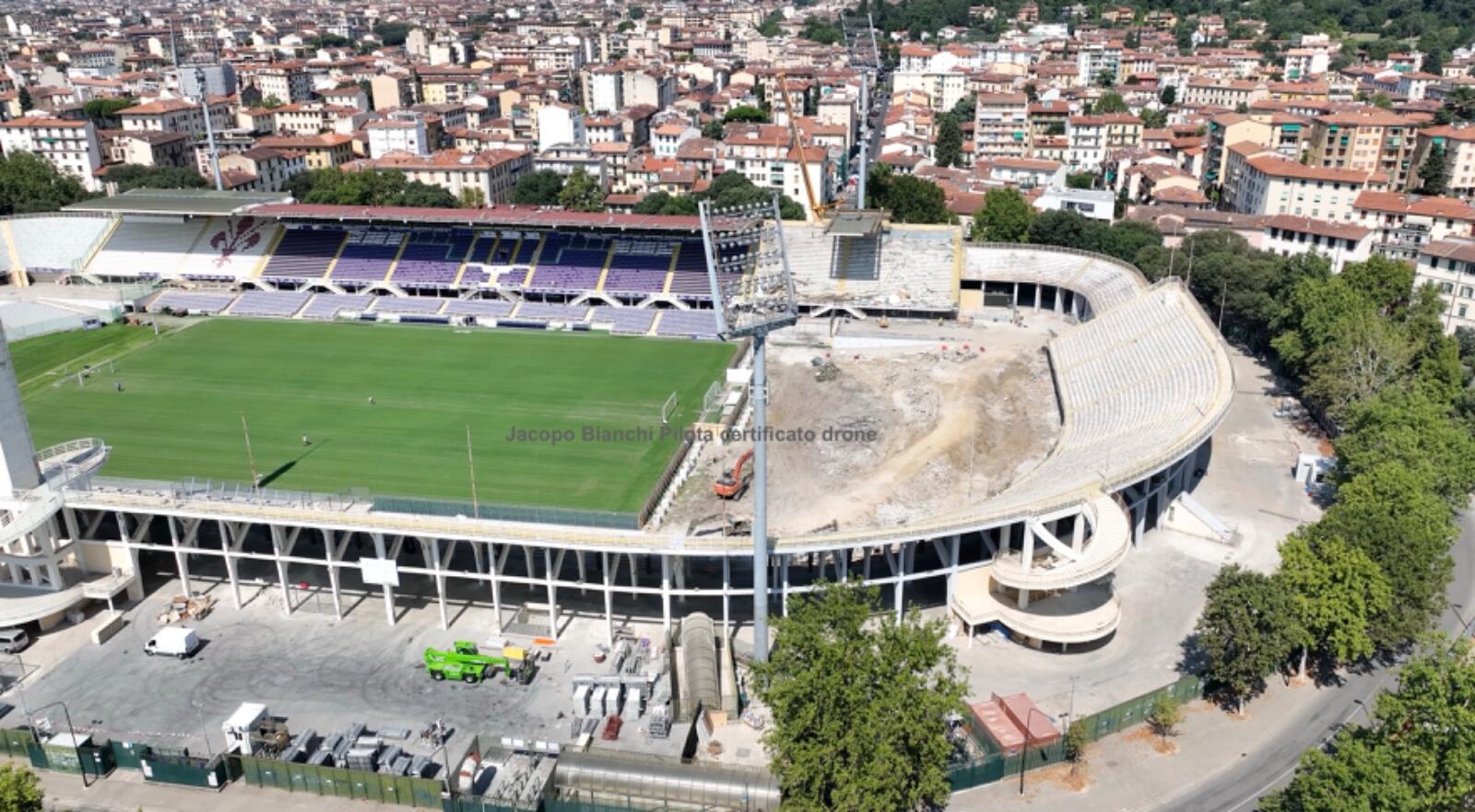 Proseguono i lavori allo stadio Franchi di Firenze. In questi giorni è in corso lo smontaggio della copertura della Tribuna laterale nel versante Curva Fiesole.Una operazione piuttosto impegnativa e che richiede grande attenzione.