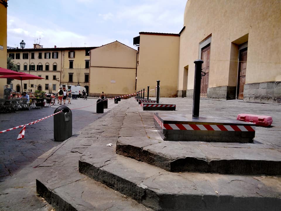 I lavori per la cordonatura dovrebbero terminare il 21 giugno. Il piano per la tutela della Basilica di Santo Spirito - lo ricordiamo - consiste in un insieme di interventi di valorizzazione del contesto urbano e delle condizioni di fruibilità in sicurezza della piazza comprendenti più azioni differenti. Per tutelare sagrato e facciate della Basilica, in particolare, il piano prevede l’inserimento di elementi di arredo in appoggio al piano del sagrato, collegati tra loro da una cordonatura. I chiodi fiorentini installati su via de’ Coverelli, invece, inibiscono la sosta non autorizzata e comportamenti scorretti.