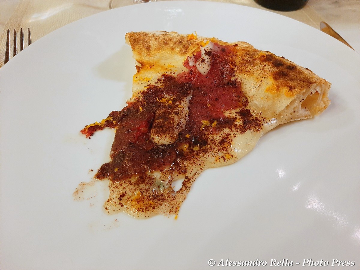 Sul fronte della pizza, invece, un must di Donato Menechella è la "pizza Carpaccio", una base di fiordilatte cui all'uscita si accompagnano carpaccio di manzo, fonduta di caciocavallo, pepe, polvere di cipolla bruciata e zest di agrumi.