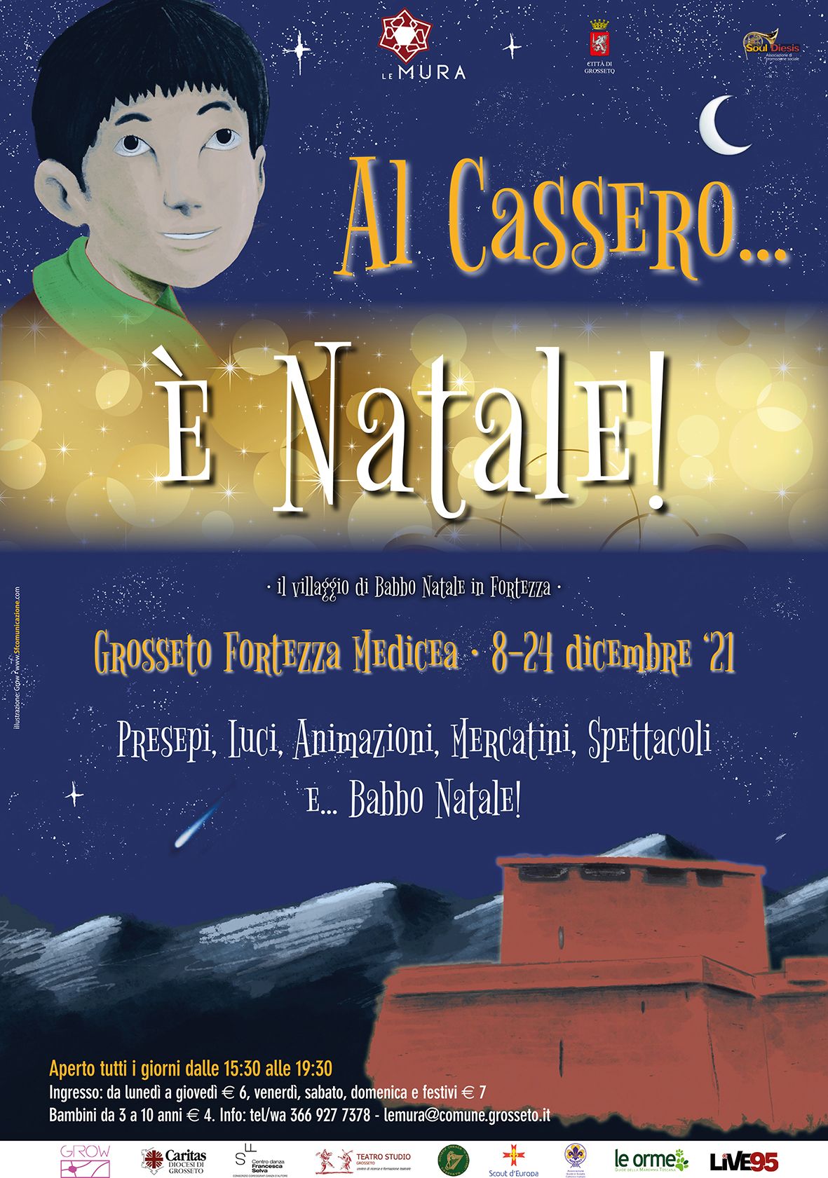 Per i più sfrenati che vorranno lanciarsi in danze natalizie ci sarà un’area dedicata alla Baby Christmas Dance. La Coop. “Le Orme” offrirà la possibilità di visite guidate della durata di circa 1 ora per adulti e bambini nei giorni di mercoledì, sabato e domenica alle 16 ed alle 17.30; la storia di Grosseto e della Fortezza Medicea con il suo Cassero senese e in esclusiva, dopo tanti anni di chiusura, visita alla terrazza panoramica del Cassero. Significativa l’iniziativa “Cirigioco” organizzata con la Caritas Diocesana di Grosseto: davanti all’ingresso della Fortezza Medicea sarà presente una tenda degli Scouts di Grosseto, che dal lunedì al venerdì dalle 17 alle 19.30 e nei giorni di sabato, domenica, 8 e 24 dicembre dalle 15.30 alle 19.30 ritireranno giocattoli usati, ovviamente in buone condizioni e sanificati, che poi verranno impacchettati dai bambini insieme agli elfi e saranno consegnati alla Caritas per essere poi donati in occasione delle festività natalizie.