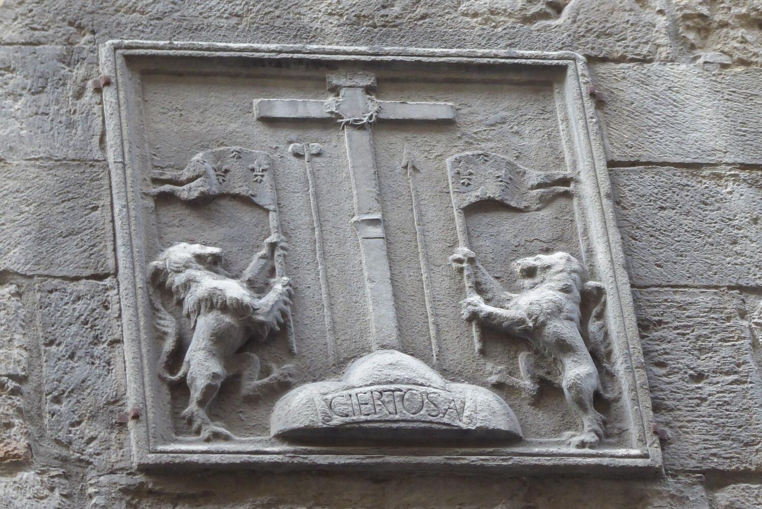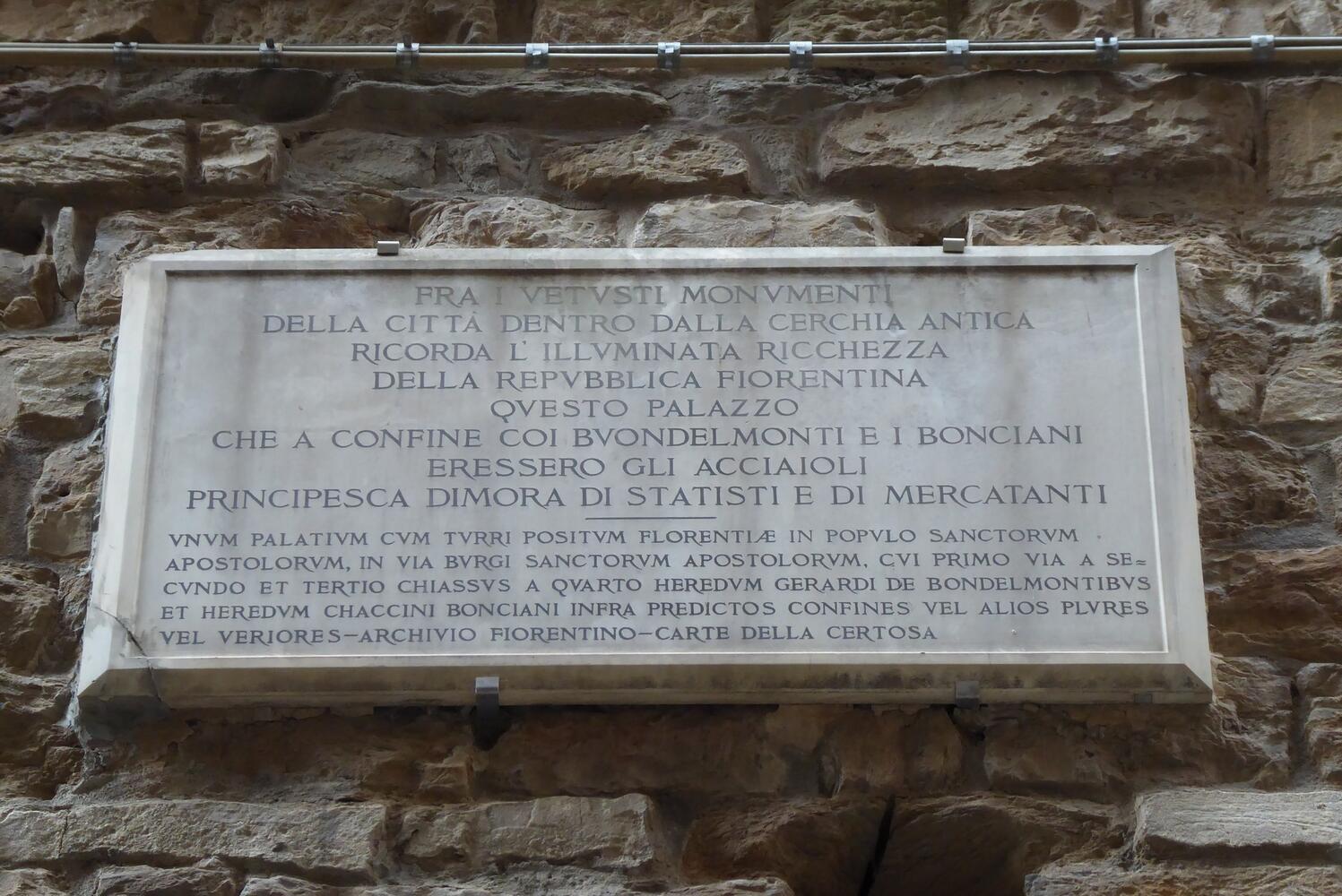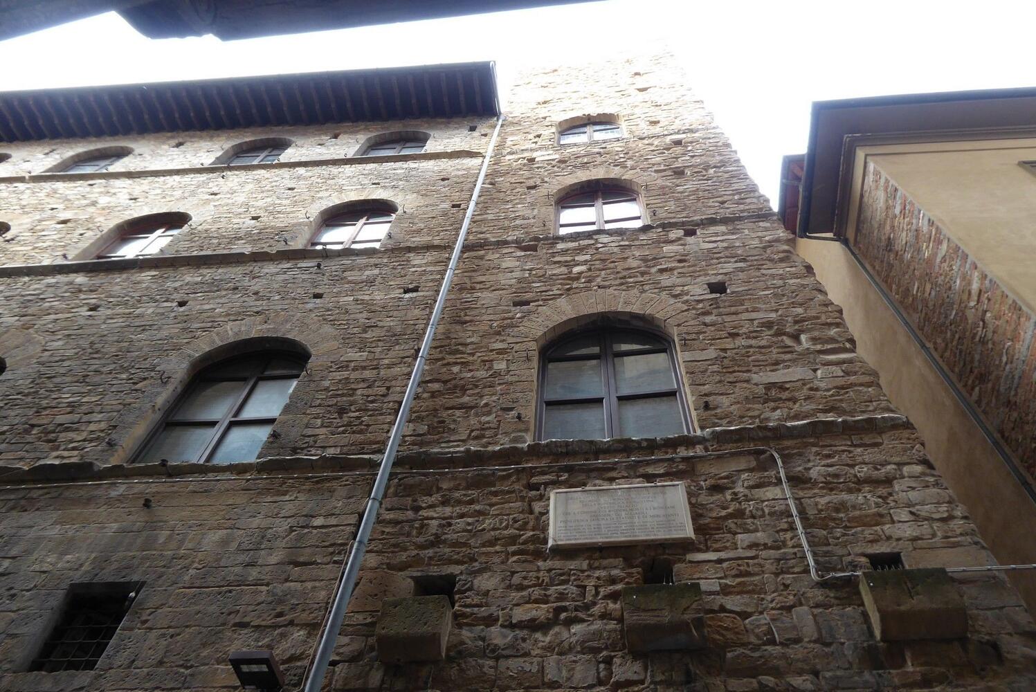 Contrappunto visivo e storico alle memorie che custodisce in Borgo Santi Apostoli la Torre Guelfa, la targa che nella vicina Por Santa Maria, a due passi da Ponte Vecchio, riporta sulla facciata della torre dei rivali Amidei quattro versi di Dante. Per bocca del trisavolo Cacciaguida, nel XVI Canto del Paradiso, negli stessi anni in cui scrive Dino Compagni il poeta rievoca l’esordio di quella conflittualità intestina che a lungo affliggerà Firenze: “La casa di che nacque il vostro fleto, / per lo giusto disdegno che v'ha morti / e puose fine al vostro viver lieto, / era onorata, essa e suoi consorti”.