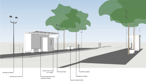 Le stazioni sono lunghe 30 metri e il veicolo viene guidato in avvicinamento da un sistema digitale che consente l'attracco il più vicino possibile alla piattaforma. Dispongono delle stesse apparecchiature delle stazioni dei tram, informazioni audio e video dinamiche in tempo reale, nonché tutte le apparecchiature necessarie per l'emissione di biglietti. È inoltre attivo un sistema di biglietteria contactless.