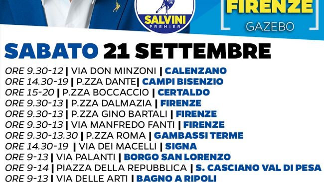 Mentre Matteo Renzi anticipa che il testa-a-testa con l'ex ministro Salvini a Porta a Porta avrà luogo "tra il 15 e il 17 ottobre", a livello locale il Carroccio è sempre molto attivo nonostante l'uscita dal Governo. Sabato 21 settembre a Gambassi Terme(FI), la Lega Salvini Premier organizza una raccolta di firme per tornare al voto per le elezioni politiche, al più presto possibile, dal titolo "Elezioni Subito". I cittadini interessati potranno firmare dalle ore 9,30 alle ore 13,30 ad un'apposita postazione ubicata nella centrale piazza Roma, nel capoluogo Gambassi. Saranno presenti tra gli altri i consiglieri comunali leghisti Marco Manuelli e Nicola Borri. Nel corso dell'iniziativa, chi lo vorrà potrà iscriversi alla Lega.