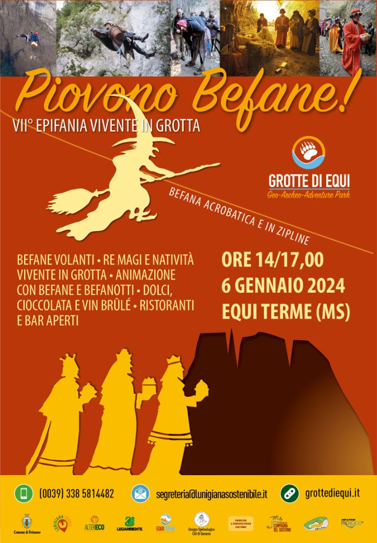Anche alle Grotte di Equi piovono Befane. La suggestiva Epifania ad Equi Terme con le befane acrobatiche che si lanciano da 30 m. di altezza e l'adorazione dei Re Magi alla Natività vivente in grotta.