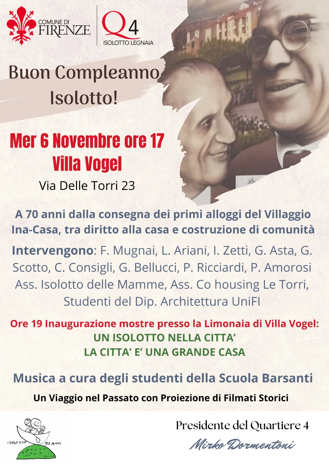 “Abbiamo costruito un incontro pubblico con interventi di esperti e di persone che hanno vissuto e vivono l'Isolotto, non solo per ricordare come è nato e cresciuto questo pezzo di città, ma per riflettere su temi importanti e attualissimi, tra come rispondere al bisogno di casa e si costruisce la comunità” afferma il presidente del Quartiere 4 Mirko Dormentoni. Mercoledì sarà anche inaugurata una doppia mostra nella Limonaia di Villa Vogel sulla storia urbanistica e sociale del popolare rione figlio dei sindaci Fabiani e La Pira che non è stato solo case ma è diventato presto città e comunità.