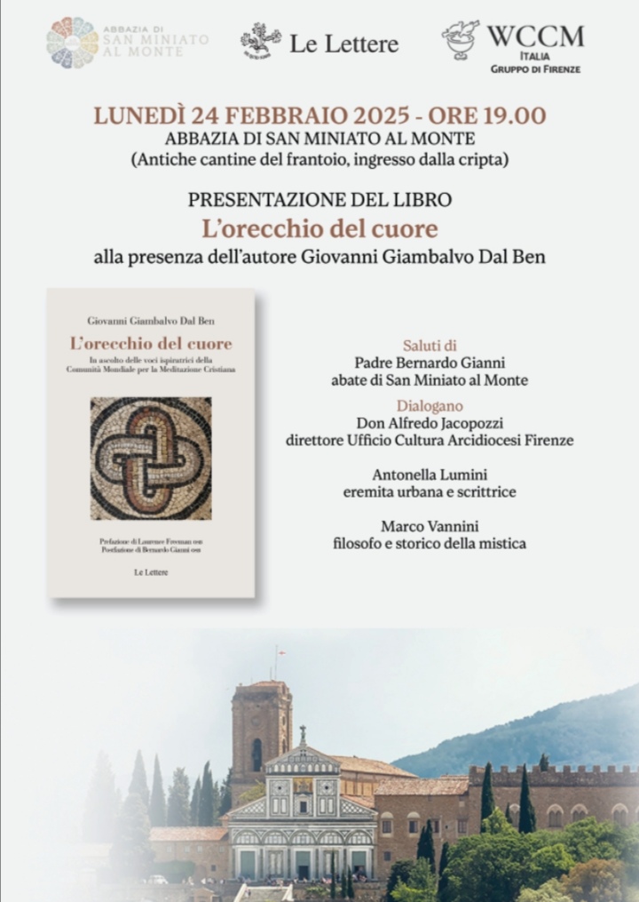 Lunedì 24 febbraio 2025, ore 19 presso l'Abbazia di San Miniato al Monte in programma «L’orecchio del cuore». Un dialogo fra Antonella Lumini, Marco Vannini e Don Alfredo Jacopozzi a margine dell’omonimo libro di Giovanni Giambalvo Dal Ben (Le Lettere 2025), "L'orecchio del cuore" (In ascolto delle voci ispiratrici della Comunità Mondiale per la Meditazione Cristiana).