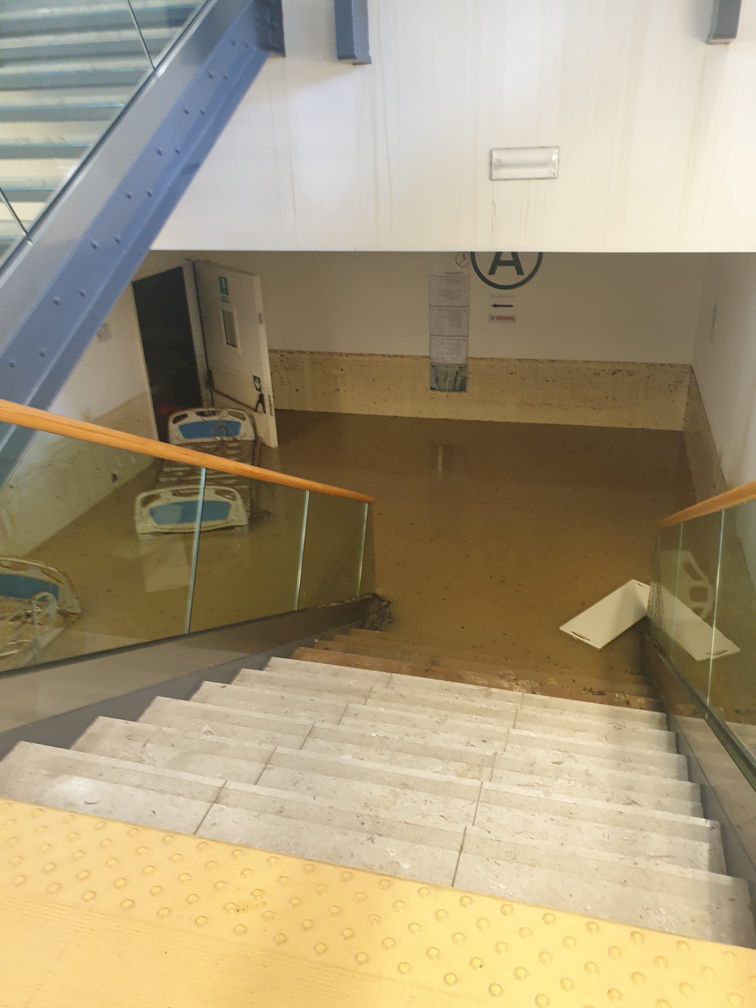 Il sottosuolo dove ci sono i servizi di cucina, lavanderia e macchinari sono stati gravemente danneggiati, come anche gli spogliatoi che non sono inaccessibili e non si sa quando ritorneranno disponibili. L'acqua ha superato più di un metro d'altezza (come si vede nella foto). Il trasporto dei pazienti è stato molto complicato dato che tutti gli ascensori erano fuori uso. Per fortuna sono intervenuti dei soccorritori per trasportare a mano dei casi urgenti. Diverse attività come i vaccini sono state sospese. L'alluvione non ha risparmiato nulla e nessuno: nemmeno le salme che erano al piano di sotto. E' stata una giornata veramente dura anche per il personale della struttura.