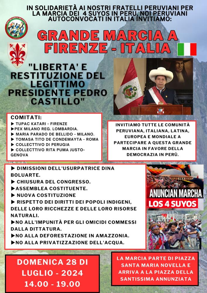 Per domenica 28 luglio 2024, alle 14:00, a Firenze, è stata convocata una marcia per il Perù, da tante realtà e comunità, non solo della Toscana.