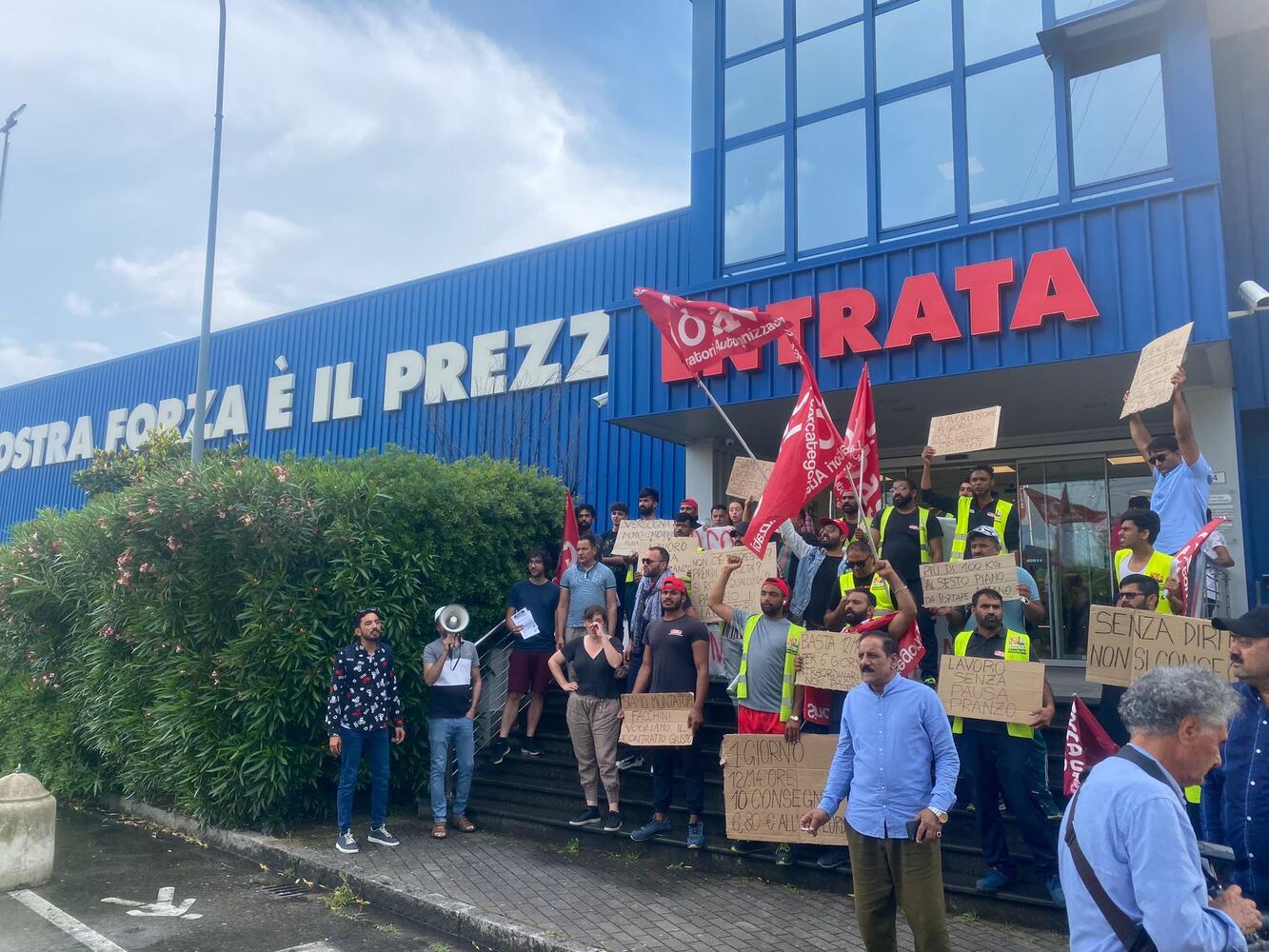 Protesta dei facchini e autisti in appalto Mondo Convenienza che da cinque giorni sono in sciopero nel magazzino di Campi Bisenzio in via Gattinella. La protesta è stata organizzata sabato pomeriggio davanti al punto vendita di via dei Confini a Prato.