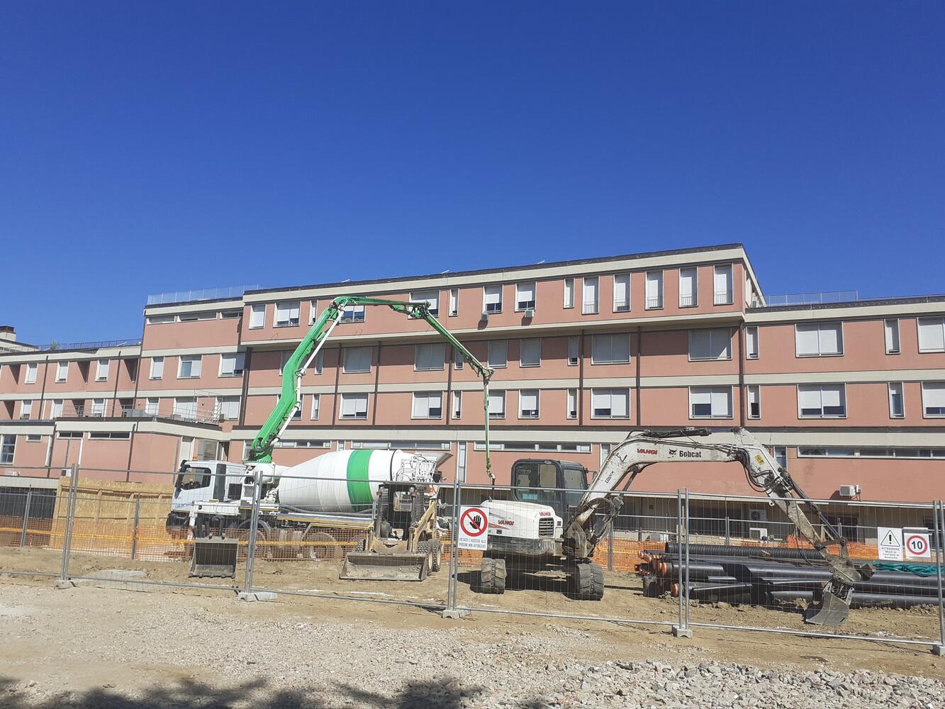Nel primo stralcio dei lavori del più ampio progetto che, secondo il cronoprogramma, richiederà una durata di circa cinque anni, è compresa la costruzione del secondo volume in ampliamento. Questo avrà funzioni prettamente sanitarie: nel seminterrato ci saranno il centro trasfusionale, i locali tecnici e della sterilizzazione; al piano terreno l’accoglienza e il CUP; al primo piano il blocco operatorio. Il primo stralcio prevede anche l’adeguamento sismico dell’ospedale con la ricucitura dei giunti strutturali esistenti e l’inserimento degli isolatori termici al piano interrato c.d. “infernotto”.