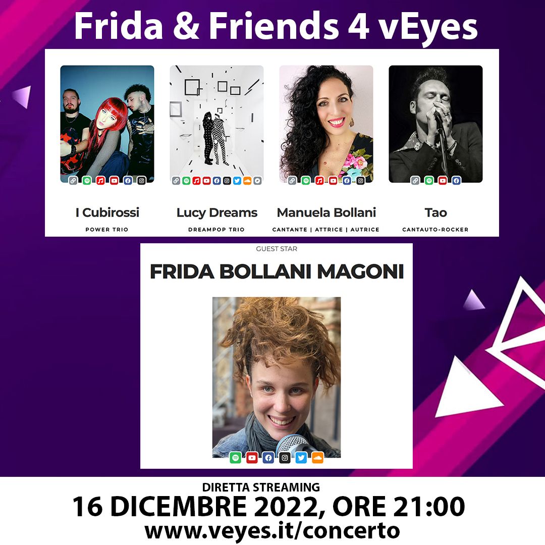 Si terrà venerdì 16 dicembre, con inizio alle ore 21, la diretta streaming dell’iniziativa Frida and friends 4 vEyes, un concerto il cui ricavato verrà interamente devoluto alla onlus vEyes, un Ente del Terzo Settore che progetta tecnologie a supporto di persone con disabilità visiva, ma anche innovativi sistemi di screening pediatrici, basati su algoritmi di intelligenza artificiale, che consentono la diagnosi precoce di malattie invalidanti della vista, oltre a piattaforme di riabilitazione visiva che fanno uso di visori di realtà immersiva e aumentata.