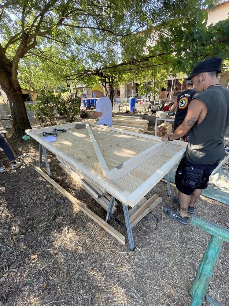 Per consentire l’accesso allo spazio ai membri della associazione ed alla cittadinanza, in occasione dell’apertura del 16 luglio, verranno realizzate alcune strutture per la funzionalizzazione dell’area, progettate e certificate dallo studio fiorentino ND e realizzate dai membri della APS secondo i criteri dell’architettura temporanea e della sostenibilità ambientale mediante l’utilizzo di materiali di riuso.Nel dettaglio verrà garantita la messa in sicurezza dell’edificio mediante la realizzazione di un “Tazebao”, una struttura realizzata in tubi da ponteggio, pannelli in legno e teli microforati che funge da “bacheca di quartiere”.