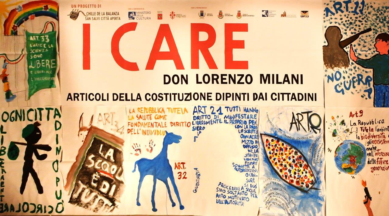 E’ nota la straordinaria rilevanza che ebbe la Costituzione della Repubblica per Don Milani. E in occasione delle celebrazioni del centenario della sua nascita, che cade il 27 maggio 2023, la compagnia teatrale fiorentina dei Chille de la Balanza lancia un progetto di partecipazione dal basso: i cittadini sono stati invitati a dipingere manifesti-numeri unici su articoli della Costituzione, da comporre in modo da dar vita a grandi manifesti di 6 metri per 3 da far affiggere in appositi spazi. Al centro dei manifesti: una grande scritta pre-stampata “I care Don Milani. Articoli della Costituzione dipinti dai cittadini”.