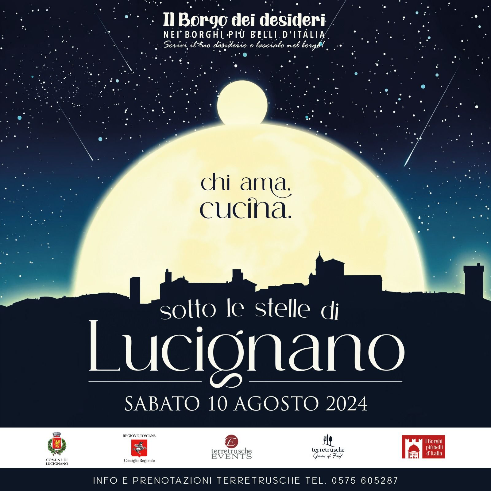 Giunta alla sua settima edizione, il 10 agosto si rinnova la straordinaria Cena sotto le stelle. Evento tanto atteso per festeggiare l’estate nella piazza del paese apparecchiata di tutto punto. “Chi Ama Cucina” è il tema di questa edizione ideata e organizzata da Vittorio Camorri di Terretrusche Events, col supporto e la collaborazione dell’Amministrazione comunale lucignanese, sindaca Roberta Casini in testa.