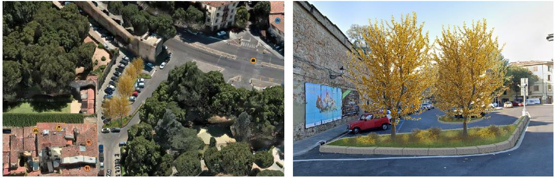 Il progetto prevede la piantumazione di 10 nuove alberature in luogo di altrettanti posti auto su Lungarno Aldo Moro e 5 nuovi alberi in Largo De Gasperi. I nuovi alberi saranno Ginkgo Biloba. La zona è attualmente priva di alberature e adibita a parcheggio. Si predispone anche la realizzazione di un’aiuola verde con arbusti in prossimità dell’incrocio tra Lungarno Aldo Moro e Largo Alcide De Gasperi.