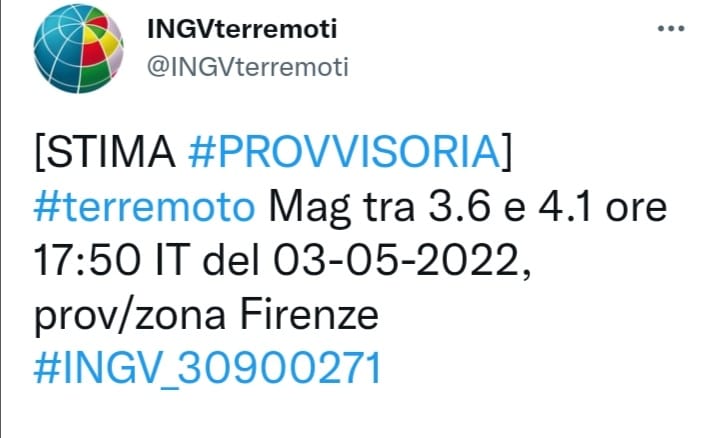Molti a Firenze l'hanno sentita distintamente, una scossa di terremoto poco fa esattamente alle 17,50. INGV, l'Istituto Nazionale di Geofisica e Vulcanologia, parla di una magnitudo tra 3,6 e 4,1 (stima provvisoria aggiornata poco fa in 3,7) e indica Impruneta come zona di riferimento.