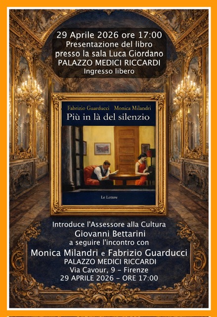 Mercoledì 29 aprile (alle ore 17.00) a Palazzo Medici Riccardi, nella Sala Luca Giordano, Fabrizio Guarducci e Monica Milandri presentano il libro "Più in là del silenzio" (Le Lettere). introduce l'incontro Giovanni Bettarini, Assessore alla Cultura Città di Firenze.