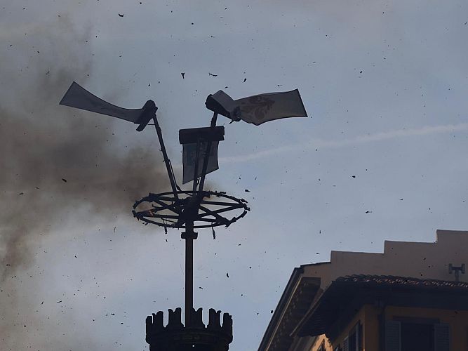 Il razzo a forma di colomba è partito dall’altare maggiore della Cattedrale nel momento dell’intonazione del Gloria, raggiungendo il Carro di Fuoco, il Brindellone, collocato tra il Duomo e il Battistero, per poi fare ritorno all’interno della chiesa. Secondo la tradizione, se la Colombina completa il percorso tornando indietro, l’anno sarà favorevole e porterà raccolti abbondanti.