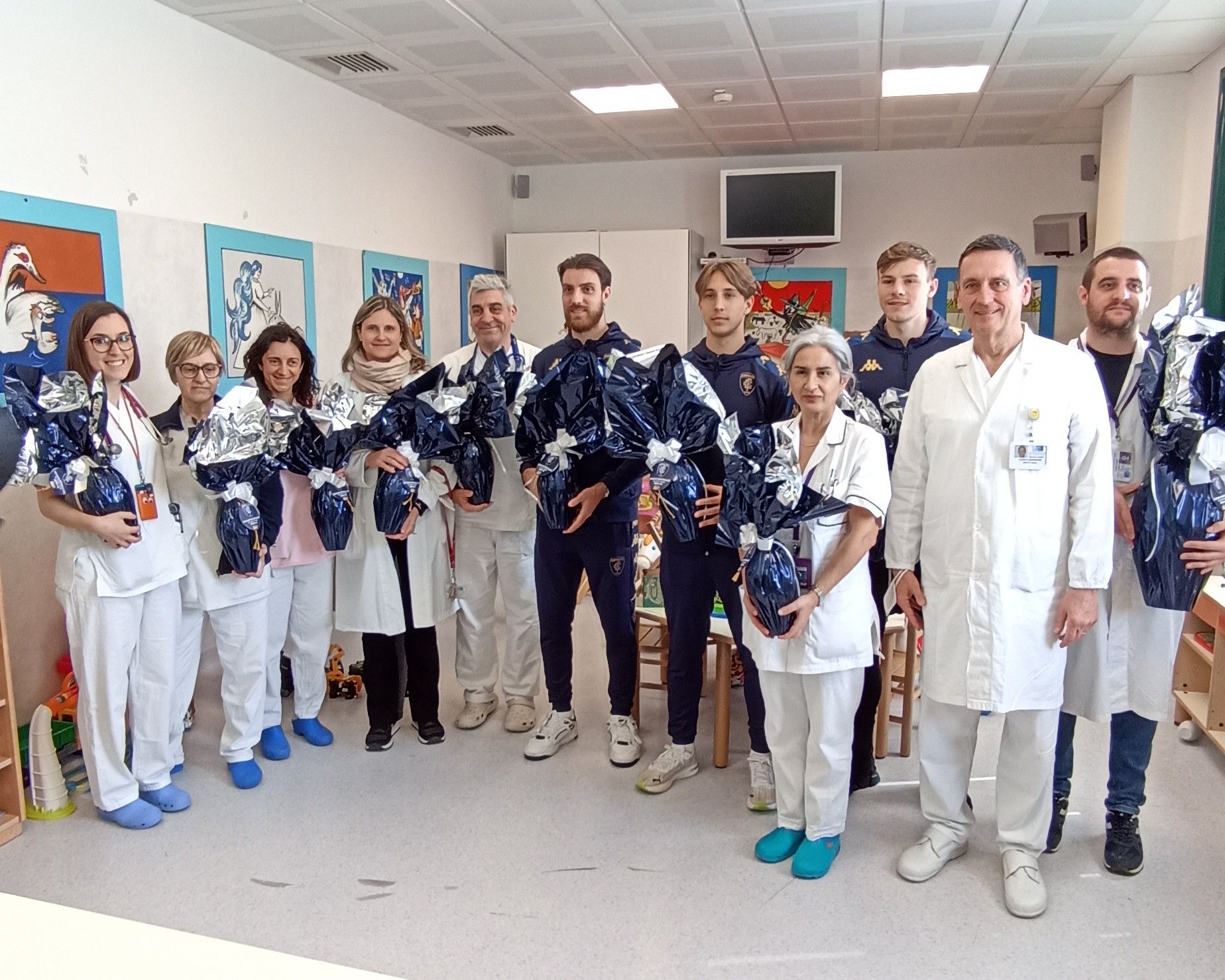 Al momento della consegna erano presenti il direttore del reparto di Pediatria Roberto Bernardini e la sua equipe, la direttrice dell'ospedale, Silvia Guarducci, Federico Manzi per la direzione sanitaria di presidio, e Massimo Calistri, direttore della chirurgia. I giocatori hanno lasciato le uova anche in Medicina 1 e altre ancora da consegnare nei reparti, augurando a tutti un buon lavoro e auguri pasquali. L'occasione è stata particolarmente gradita per ringraziare tutti gli ospiti delle visite che ogni anno riservano sia al Reparto di Pediatria che a tutto l'Ospedale San Giuseppe.