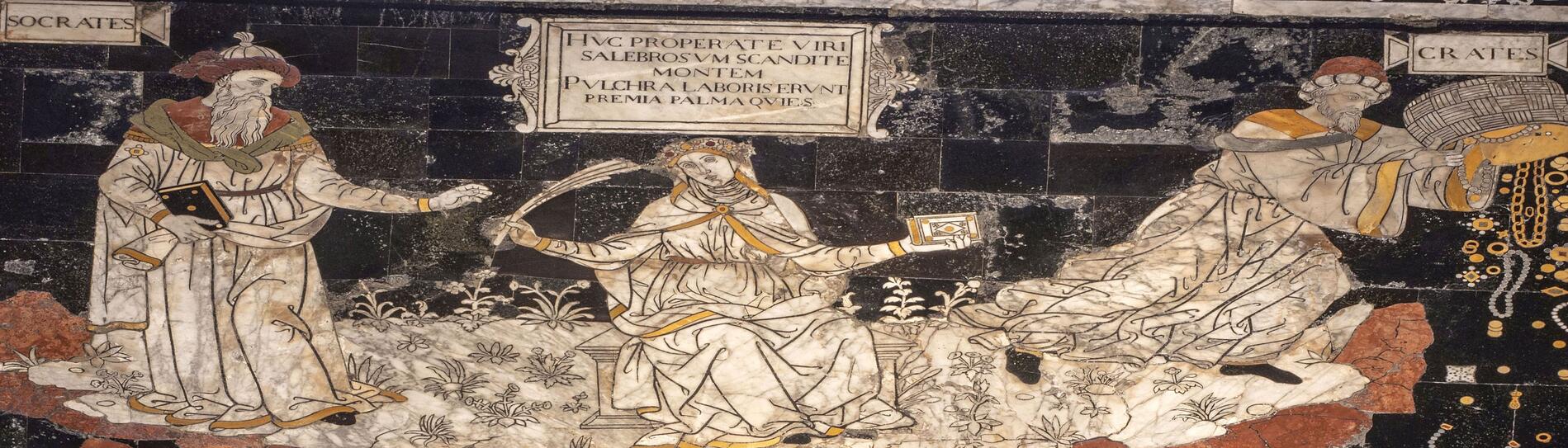Il percorso si apre con l’iscrizione d’ingresso, davanti al portale centrale, un invito a entrare “castamente” nel Virginis templum, la casa di Maria, testimonianza del forte legame che i cittadini senesi hanno da secoli con la loro ‘patrona’: Sena vetus civitas Virginis. La Madonna si definisce anche come Sedes Sapientiae, sede di Sapienza e, subito dopo, la scritta è seguita dalla celebre tarsia con l’Ermete Trismegisto, il sapiente egiziano, il primo grande teologo dell’antichità. Seguono filosofi come Socrate e Cratete nella tarsia del Pinturicchio, Epitteto, Aristotele, Seneca ed Euripide che corredano la Ruota della Fortuna e invitano al distacco dai beni terreni, futili, anzi ingombranti per dedicarsi al pensiero filosofico.