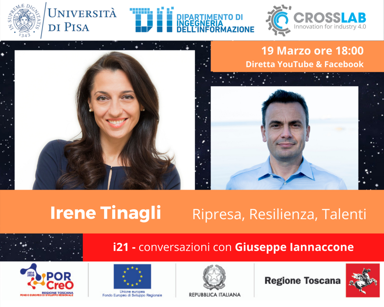 Venerdì 19 marzo, alle 18 Irene Tinagli sarà in diretta streaming su YouTube e Facebook insieme a Giuseppe Iannaccone dell’Università di Pisa per parlare di "Ripresa, resilienza, talenti". Al centro dell’incontro le opportunità e i rischi della ripresa post Covid in l’Italia e l’Europa, le due transizioni digitale ed ecologica, i giovani e la formazione.