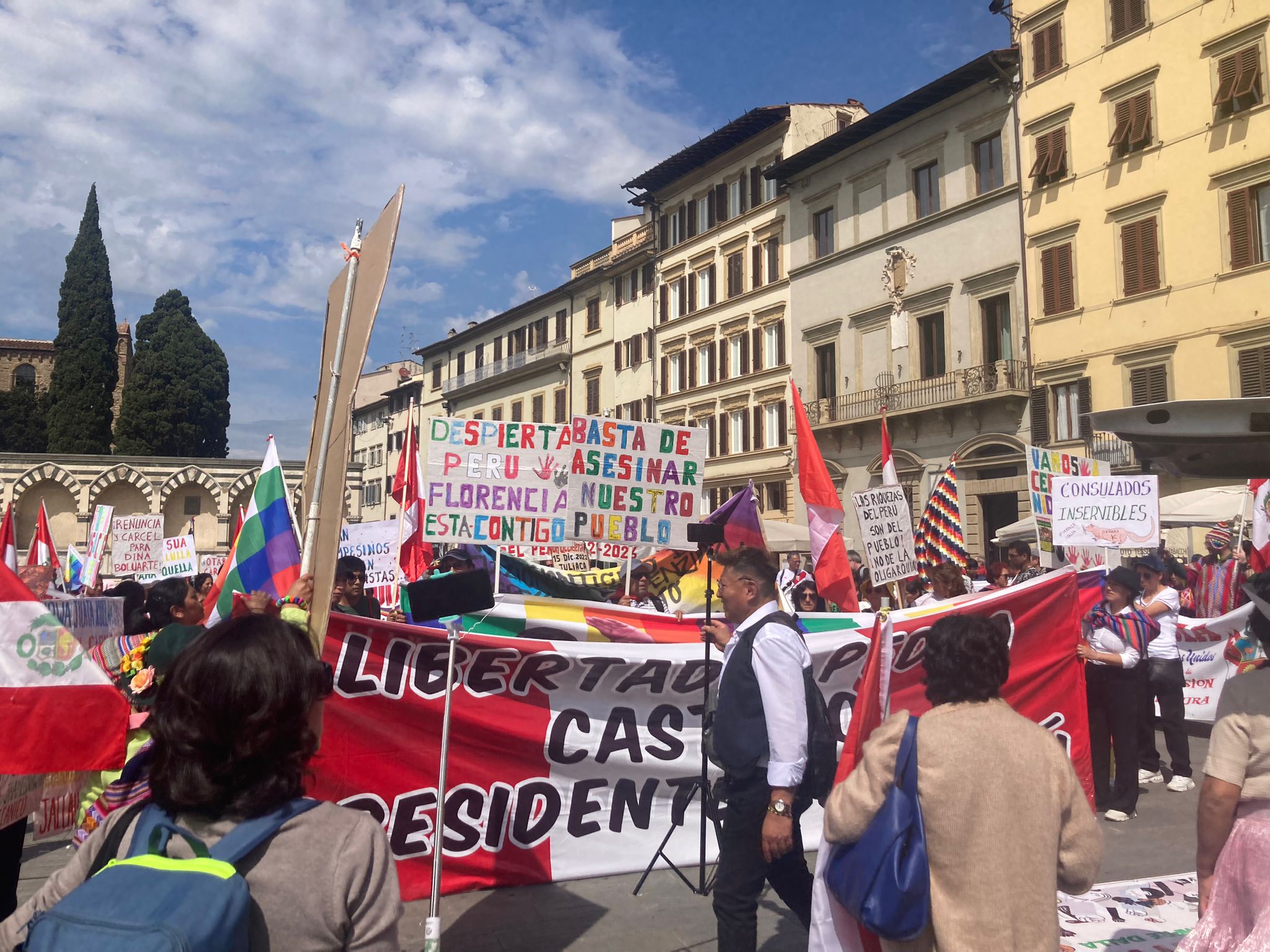 Mobilitazione oggi pomeriggio in piazza Santa Maria Novella convocata dal Frente de Peruanos, in sostegno delle manifestazioni di questi mesi in Perù, dove il Presidente è incarcerato, inoperativo il Parlamento e morti nelle strade, dovute a una gestione repressiva dell'ordine pubblico.