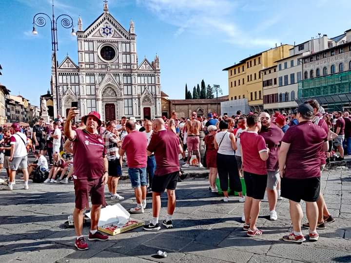 FOTOGRAFIE - Pomeriggio speciale per il centro di Firenze e per piazza Santa Croce in particolare. Centinaia e centinaia di tifosi degli Heart of Midlothian sono accorsi raggruppandosi in questo storico luogo prima di prendere le navette che li porteranno allo stadio.