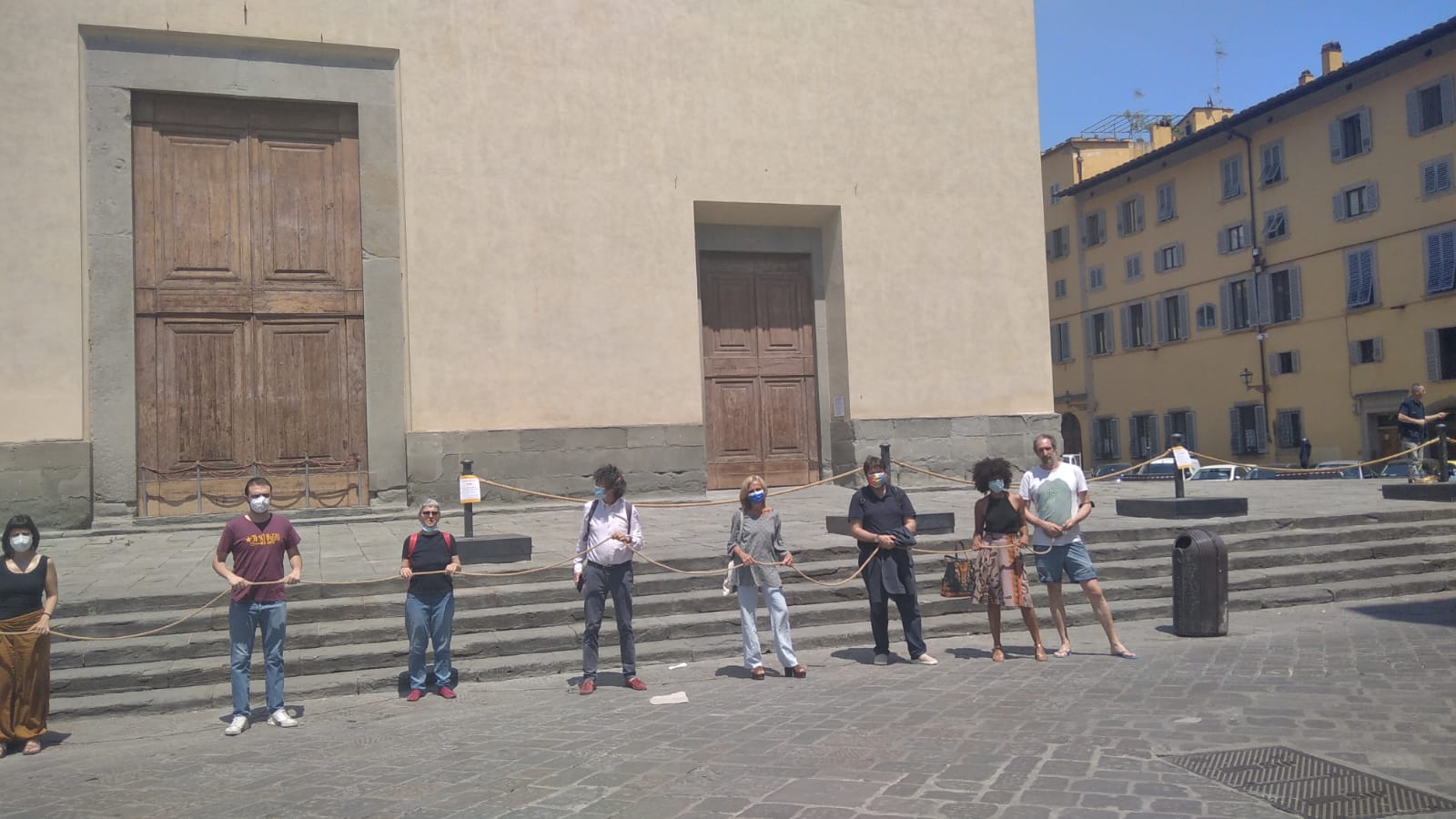 Dopo la realizzazione della cordonatura attorno al sagrato di Santo Spirito, stamani i consiglierai comunali Antonella Bundu e Dmitrij Palagi e i consiglieri del Q1 di Sinistra Progetto Comune Giorgio Ridolfi e Francesco Torrigiani, insieme a rappresentanti della associazione Progetto Firenze, a Tomaso Montanari (critico d’arte) e a Laura Lombardi (storica dell'arte, docente all'accademia di Belle Arti di Brera e residente in Santo Spirito) hanno presentato in piazza alcune proposte su come affrontare i problemi nel breve e nel lungo periodo.