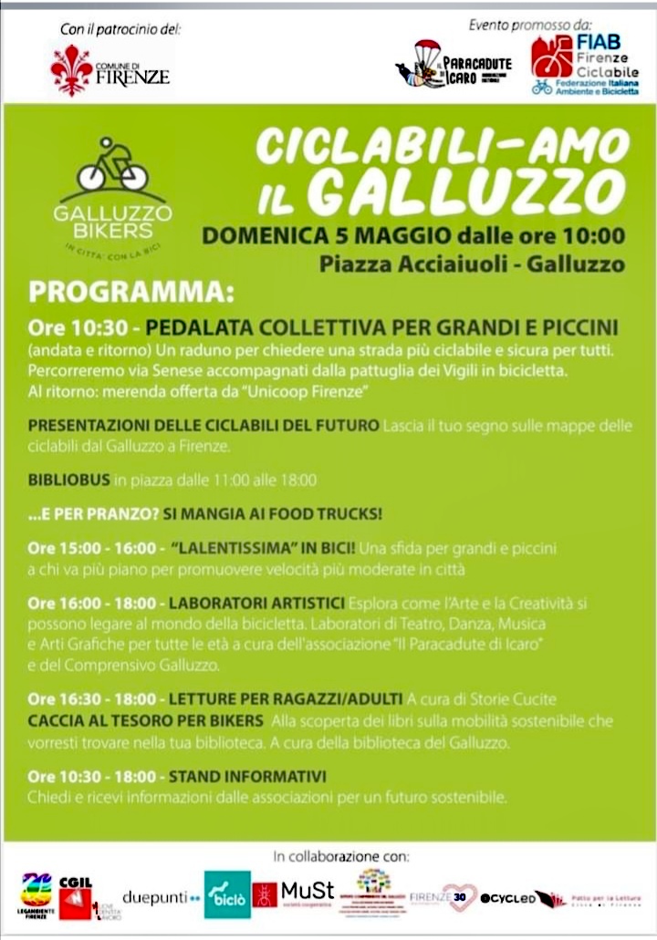 Il programma: ritrovo alle 10 in piazza Acciaioli, alle 10,30 poi pedalata collettiva di grandi e piccini con i vigili urbani in bicicletta e al ritorno spuntino offerto da Unicoop Firenze. Partenza e arrivo in piazza Acciaioli.