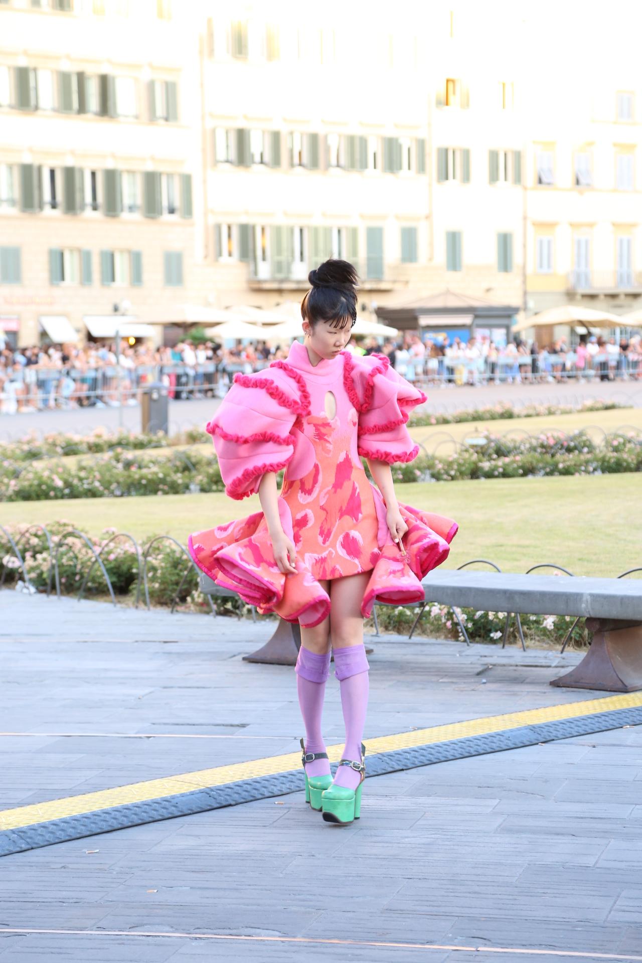Una piccola folla di curiosi si è radunata alle transenne di Piazza Santa Maria Novella, trasformata nel giardino Art Thou, final graduation show di Polimoda, l’evento-installazione, con accompagnamento musicale, per 27 talenti creativi della scuola. Di fatto la prima sfilata alla vigilia di Pitti Uomo 100. Mai nei 35 anni della scuola avevano sfilato insieme le creazioni di tutti i corsi e master dell’area design. La manifestazione era arricchita dalle opere dell’artista britannico Rob Mulholland, che al termine dell’evento fiorentini e turisti hanno potuto fotografare da vicino.