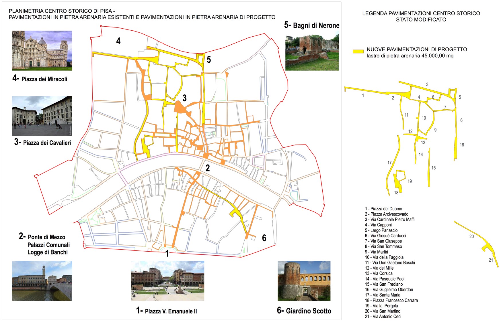 Si tratta di un intervento di riqualificazione di alcune pavimentazioni stradali del centro storico caratterizzate da lastrici, finalizzato al superamento delle barriere architettoniche, con potenziamento dell’impianto di illuminazione e sistemi di sicurezza. Le operazioni preliminari al progetto sono state quelle del censimento dei materiali presenti sul suolo del centro storico che è stato digitalizzato. L’Amministrazione Comunale ha già realizzato la riqualificazione di alcune pavimentazioni del centro storico utilizzando pietra arenaria, concentrandosi sull’asse turistico sud-nord dalla stazione ferroviaria fino a Piazza dei Miracoli passando per Piazza V.