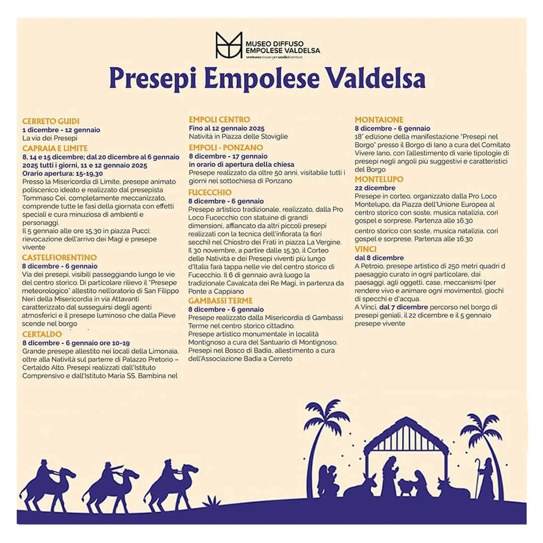 Anche a Certaldo è tempo di presepi e l'appuntamento è nel borgo medievale di Certaldo per domenica 8 dicembre 2024 ore 15.00 , con la tradizionale apertura del Presepe nella “Limonaia”, realizzato dall'Associazione centro storico di Certaldo Alto. Il presepe resterà aperto tutti i giorni, festivi compresi, fino all’Epifania (6 Gennaio 2025). Contemporaneamente, domenica 8 dicembre saranno inaugurati anche i Presepi allestiti dalle Scuole dell’Infanzia e dalle Classi delle Scuole Primarie di Certaldo nel Chiostro del Convento degli Agostiniani. Sotto il loggiato di Palazzo Pretorio, infine, sarà inaugurata la rappresentazione della Natività.