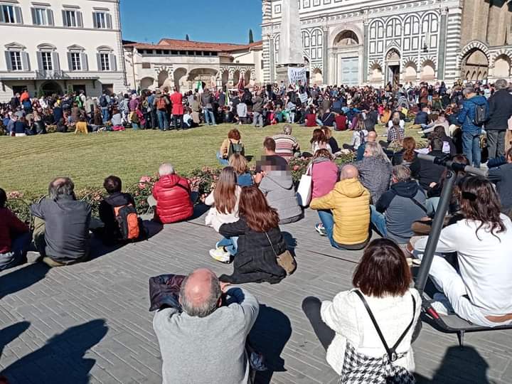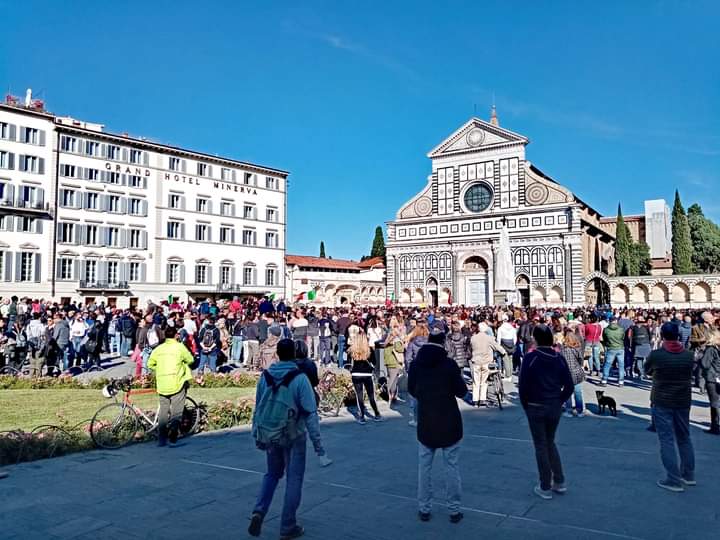 FOTOGRAFIE - In corso, quando sono circa le 10,45, la manifestazione contro il Green pass, la certificazione verde anti Covid, in piazza Santa Maria Novella. Ci sono anche studenti. La zona è presidiata dalle forze dell'ordine.