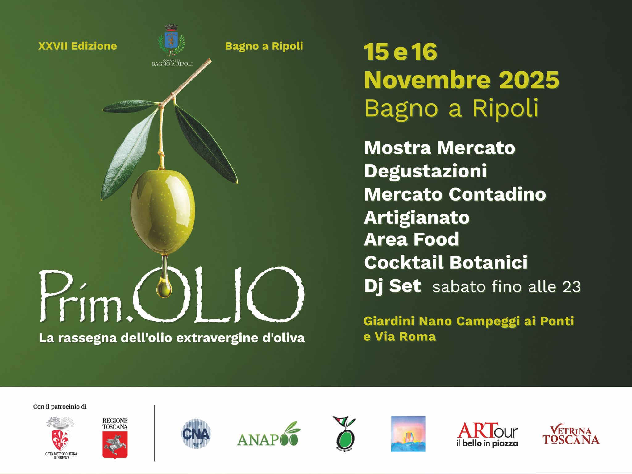 L’olio “novo” torna protagonista a Bagno a Ripoli con la 27^ edizione di PrimOlio, in programma sabato 15 e domenica 16 novembre ai Giardini “Nano Campeggi” ai Ponti e su via Roma.