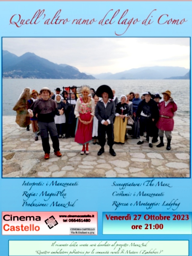 Serata benefica organizzata da ManzAid (www.manzaid.org) al Cinema Castello (via Reginaldo Giuliani 374, Firenze). Venerdí 27/10 ore 21:15 premiére del film “Quell’altro ramo del lago di Como”. La versione autentica, in vernacolo toscano, de 'I Promessi Sposi'. Prodotto da ManzAid ed interpretato dai Manzonauti. Presenti in sala attori e regista.